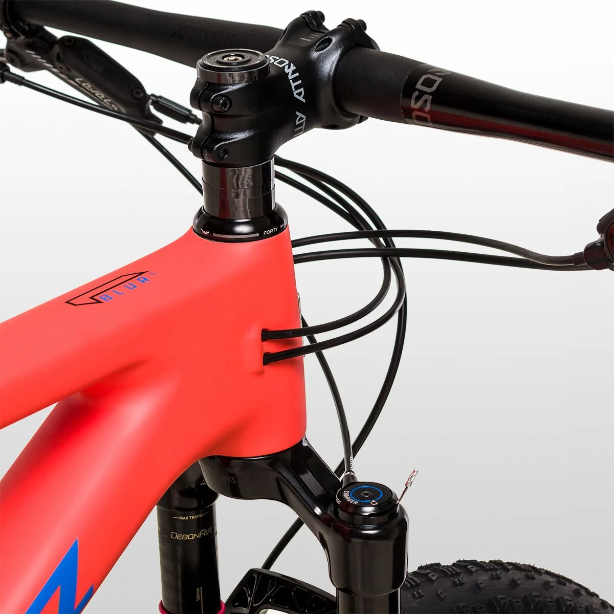 Geometry on the Blur is dialed in for speed all while giving us plenty of composure when we’re cross-eyed and dead tired. The progressively slacked out 68.3-degree head-tube angle keeps us rolling over trail obstacles while mated to our big 29in tires. A nice and steep 76.5-degree seat-tube angle has us over the center of the bike and charging hard on the climbs, all while keeping us comfortable while we’re pedalling hard through flowy chunky terrain. Reach on the blur is appropriate for the build, and a medium getting 450mm of reach means in that rough downhill terrain we won’t be needing to squeeze the brakes quite as hard.
